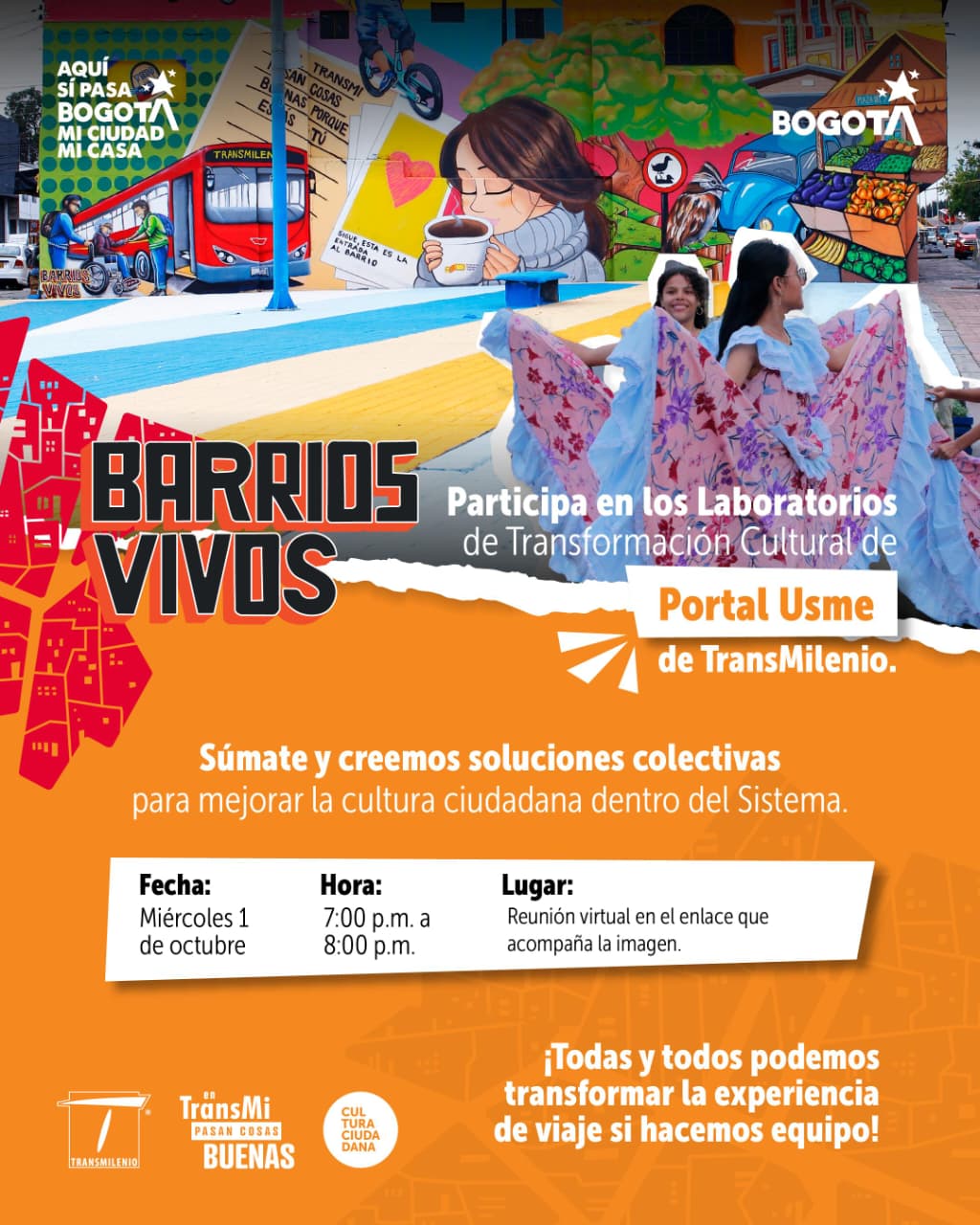 Este encuentro hace parte del proyecto Barrios Vivos, liderado por TransMilenio y apoyado por la SCRD, que invita a los habitantes de las diferentes localidades a participar activamente en procesos de transformación cultural de Bogotá.