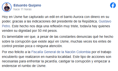 Por su parte, el edil Eduardo Quijano, integrante del Pacto Histórico, también se pronunció sobre el hecho a través de sus redes sociales en donde a su vez extendió un agradecimiento al presidente Gustavo Petro y felicitó a la Fiscalía General de La Nación, señalando un presunto trabajo encubierto realizado en la localidad.