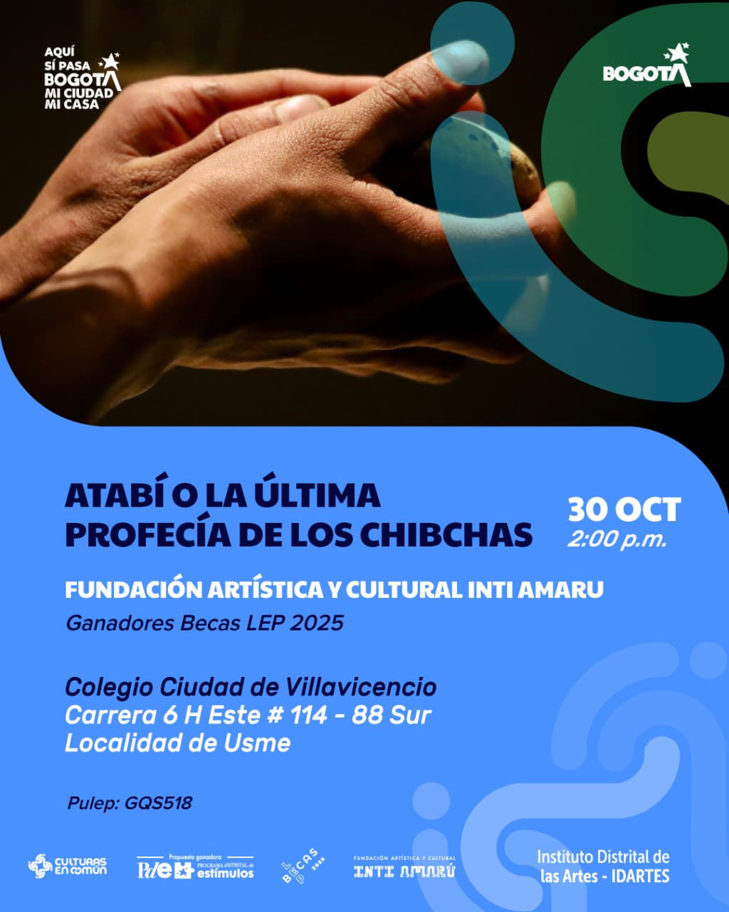 Este jueves 30 de octubre a las 2:00 p.m., en el Colegio Ciudad de Villavicencio (Carrera 6 H Este #114-88 Sur, localidad de Usme), se presenta la obra de teatro “Atabí o la última profecía de los Chibchas”, una producción de la Fundación Artística y Cultural Inti Amaru, ganadora de las Becas LEP 2025. La entrada es libre hasta completar aforo.