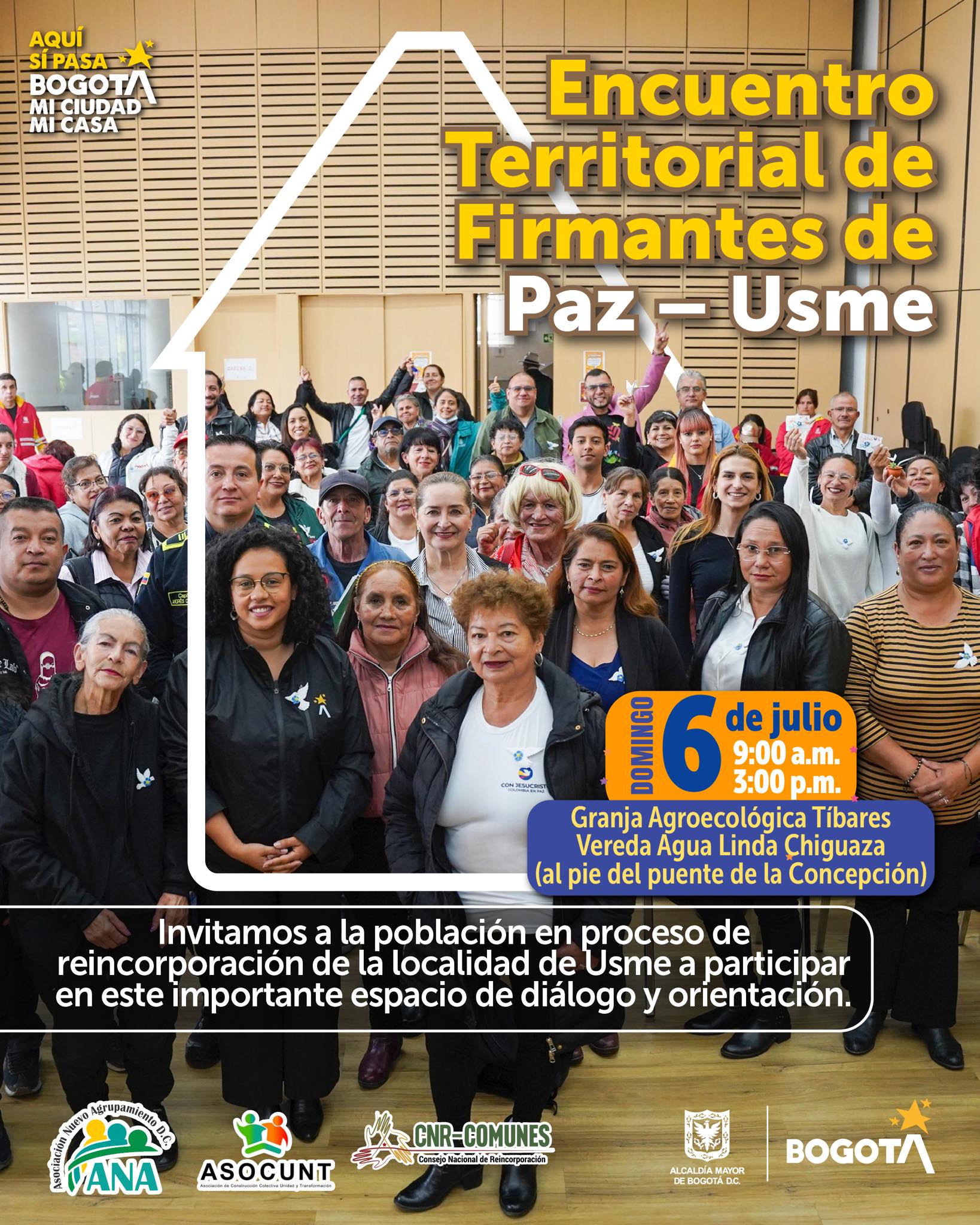 Este domingo 6 de julio, la localidad de Usme acogerá el Encuentro Territorial de Firmantes de Paz, un espacio de diálogo, orientación y construcción colectiva dirigido a la población en proceso de reincorporación. La jornada se desarrollará de 9:00 a.m. a 3:00 p.m. en la Granja Agroecológica Tibares, ubicada en la vereda Agua Linda Chiguaza, al pie del puente de la Concepción.