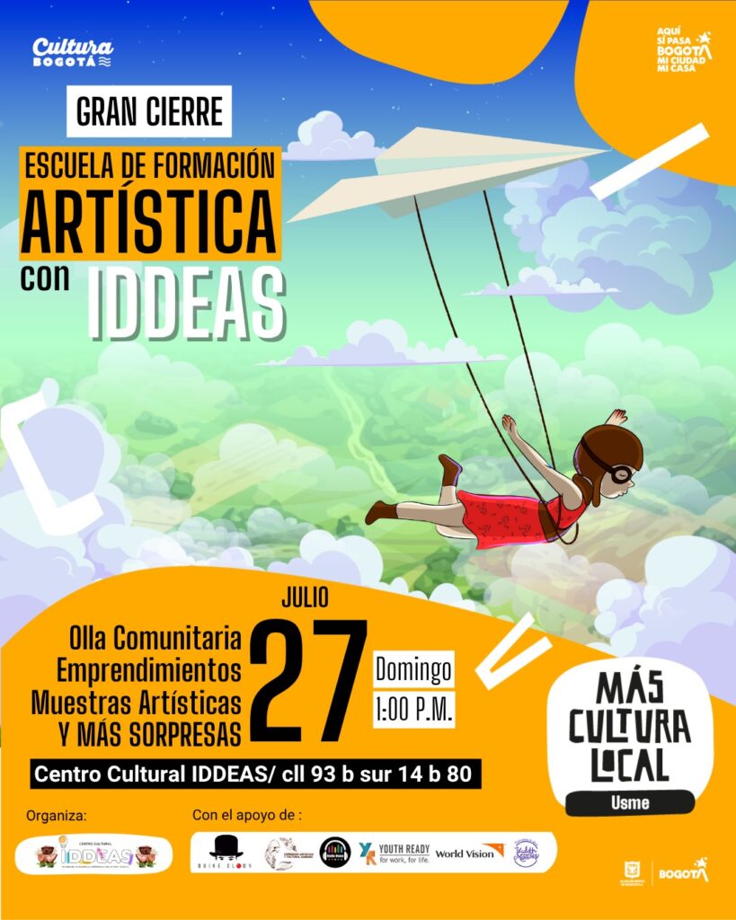 El arte florece en Usme y queremos celebrarlo contigo 🎭✨. Este domingo 27 de julio a la 1:00 p.m., te invitamos al Gran Cierre de la Escuela de Formación Artística con IDDEAS, un encuentro para compartir procesos, talentos y sueños construidos colectivamente.